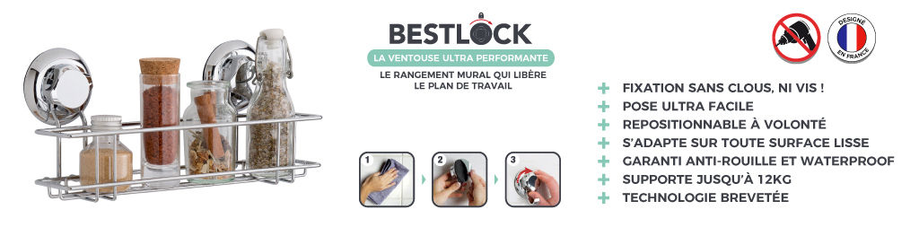 Rien de plus simple, après dépoussiérage de la surface parfaitement lisse, et non poreuse, comme le carrelage, le verre ou les miroirs, il suffit de positionner la ventouse du crochet BestLock à l’endroit désiré, d’appuyer fermement en son centre et de tourner le bouton d’un quart de tour ; le système de succion de la ventouse permet de créer un vide d’air et le crochet BestLock est ainsi fermement fixé sur le mur, prêt à être utilisé.
