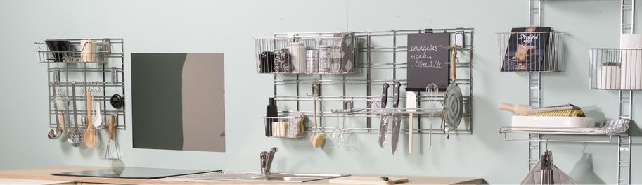Constitué de crémaillères innovantes, de grilles, de crochets et tablettes à clipser ce nouveau concept de rangement esthétique et modulable offre une infinité de combinaisons, permettant à chacun d'exploiter à sa façon tout l'espace dont il dispose.
