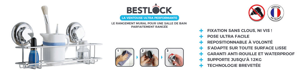 Grâce à la gamme Bestlock de Compactor, le rangement de la salle de bain est un vrai jeu d'enfant ! Sans vis ni perceuse, ce système de ventouses ultra-performant permet de fixer au mur tous les accessoires de toilette et de beauté du quotidien. Serviettes, savon, shampooings mais aussi miroir ou sèche-cheveux : ranger avec nos supports et étagères de salle de bain qui s'installent d'un geste sans abîmer les murs.
